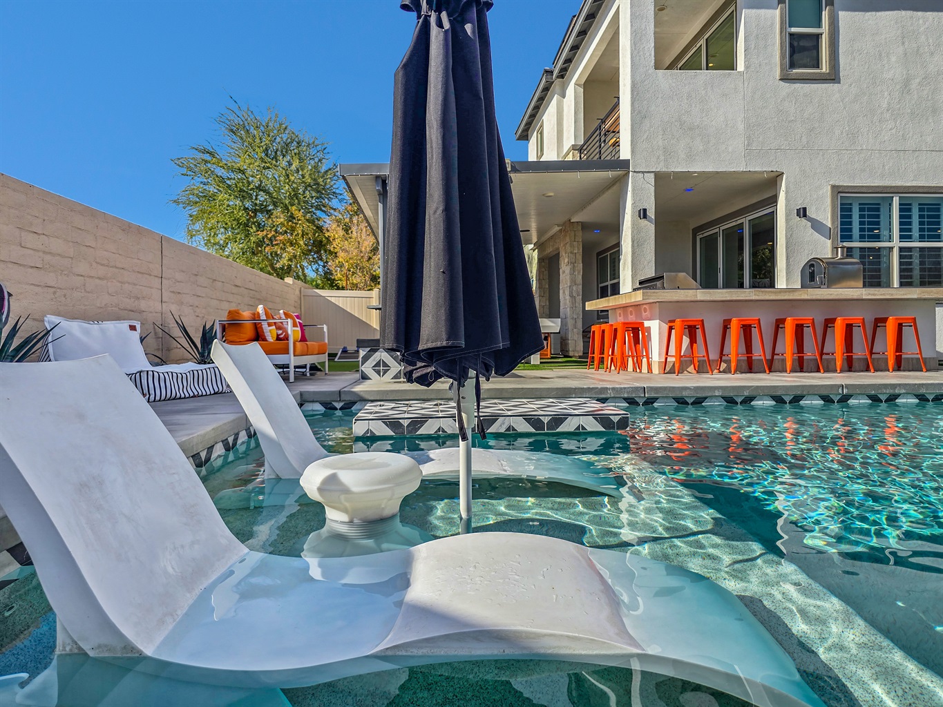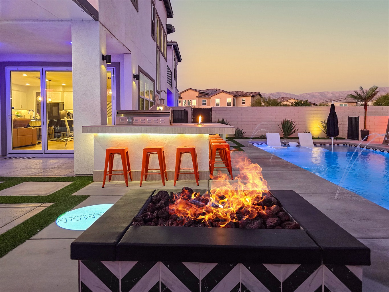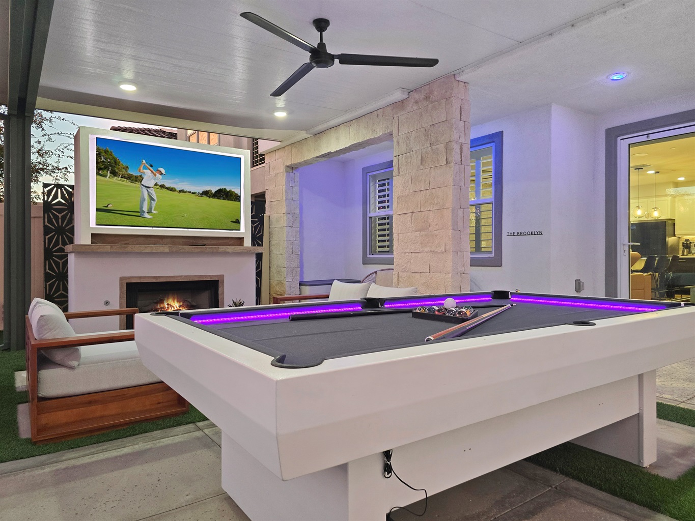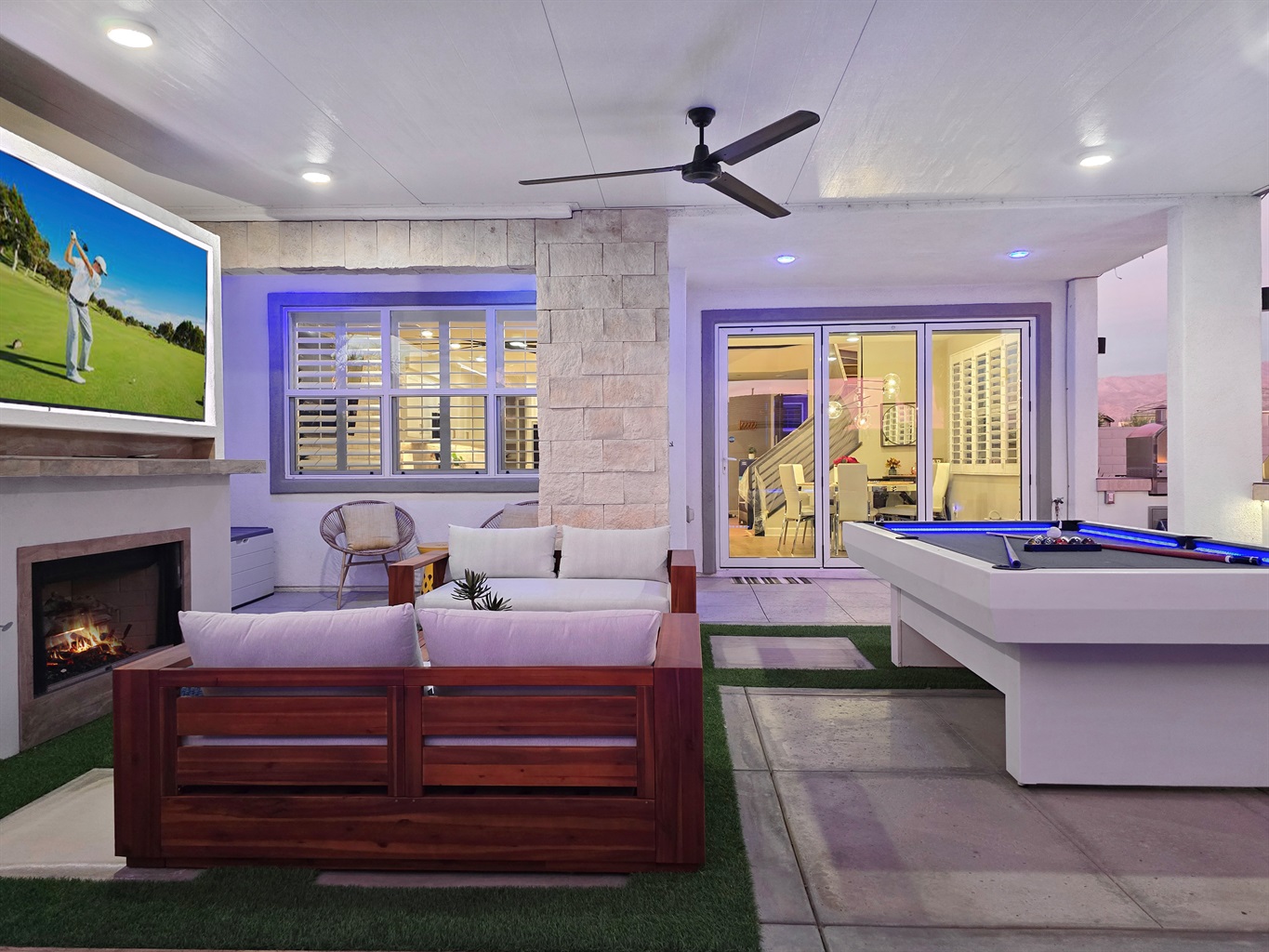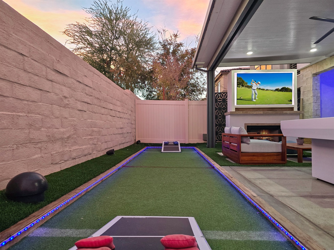 In this beautiful space, you’ll feel like you’re in a private resort. Put the game on the TV while creating a delicious pizza using the pizza oven. Swim some laps in the Olympic-sized saltwater pool before lounging poolside. Play pool, ping pong, or work on your putting in between dips in the pool to cool off. Misters will keep you cool as you enjoy fun in the sun.